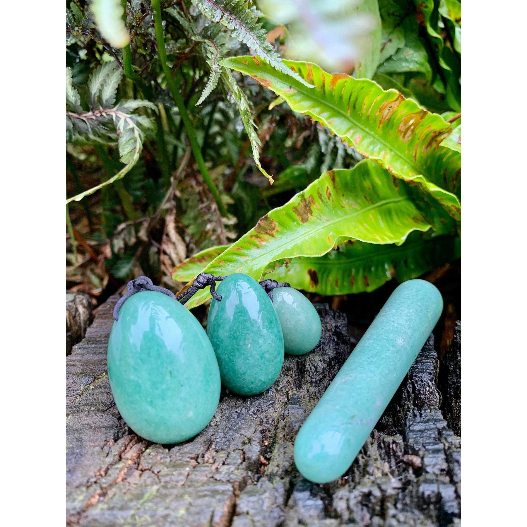 Handmade Green Aventurine drilled Yoni Eggs with a massage wand.