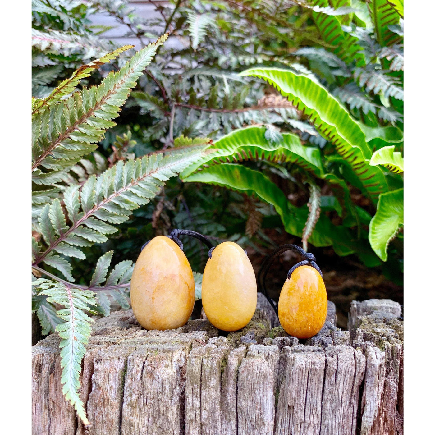 This Beautiful handcrafted set of yoni eggs includes 3 eggs: 1 x 30x20mm 1 x 40x25mm and 1 x 45x30mm. Drilled holes with a rope for easy insertion and exertion.